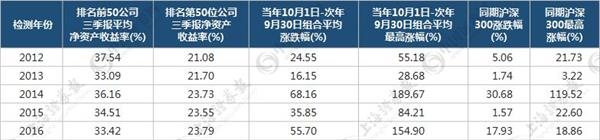 从统计可以明显看到,2012年以来每年三季报披露的净资产收益率排名前50位公司,如果在三季报披露一结束后的10月份开盘就买入的话,在此后一年内,无论是年度涨幅还是年度最高涨幅,该组合都是远远超越了沪深300指数的表现。