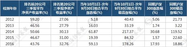 进一步地,如果以每年三季报披露的净资产收益率排名前20位公司作为组合,来观察此后一年内的表现(见下表)。