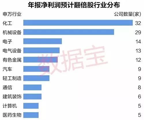 从净利润预计增幅中值来看,逾七成上市公司今年净利润有望比上年同期实现增长,其中182家上市公司净利润增幅有望翻倍。数据显示,这182家上市公司主要分布在化工、机械设备、电子、电气设备、有色金属行业,这5个行业合计占比过半。化工行业上市公司最多,有32家,其次是机械设备行业。