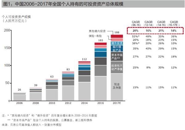 根据2017招商-贝恩《2017中国私人财富报告》显示,2016年我国个人持有的可投资资产总规模为165万亿、个人可投资资产规模在1000万以上的高净值人士数量达到158万、高净值人群共持有可投资资产49万亿,预计到2017年底中国高净值人群数量将达到197万人。