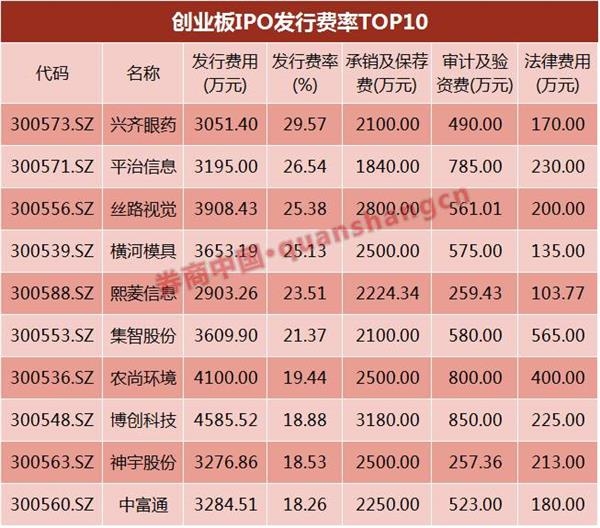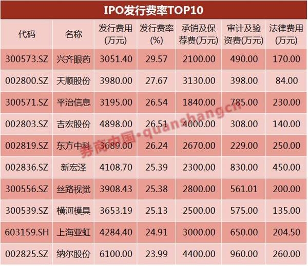 数据显示,去年248个IPO项目中,平均发行费率为7.24%,最高的发行费率为兴齐眼药的29.57%,该公司募资1.03亿元,但发行费用就花去了3051.40亿元。其中承销及保荐费2100万元、审计及验资费490万元和法律费用170万元等。
