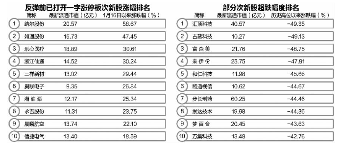 数据显示,半年内上市的次新股,1月16日以来大幅反弹的个股数量显著多于上市时间在半年以上一年以内的次新股。不过,仍有一些上市不足半年的次新股超跌显著。其中,汇顶科技、古鳌科技、富森美、来伊份、和仁科技等个股最新价较历史最高价跌幅均超过45%。