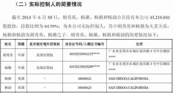 最新招股书显示,胡秀英、杨稹、杨勍为美国国籍。杨璐为中国国籍,拥有美国居留权。据《经济导报》报道,鲜为人知的是,杨璐、胡秀英一家四口,有三人已经取得美国国籍,一人持有美国居留权。杨璐之妻胡秀英持有金太阳研磨41%股份,为第一大股东,是美国国籍,入籍证书编号为37378457。杨璐为金太阳研磨董事长、总经理,是公司的前台老板,其虽然仍是中国国籍,但已经取得美国居留权。他们的两个儿子也是美国人。拟招股书显示,杨稹1989年出生,硕士学历,美国国籍,2015年6月至今待业;杨勍也是1989年出生,博士在读,美国国籍。