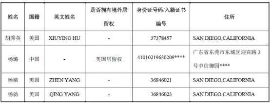 XIUYING HU(胡秀英)持有本公司 27,429,000 股股份,持股比例为 41.00%,为公司控股股东。XIUYING HU(胡秀英)、杨璐、ZHEN YANG(杨稹)和 QING YANG(杨勍)合计持有本公司 43,210,041 股股份,持股比例为 64.59%,为本公司实际控制人,其中 XIUYING HU(胡秀英)和杨璐为夫妻关系,ZHEN YANG(杨稹)和 QING YANG(杨勍)为 XIUYING HU(胡秀英)、杨璐之子。胡秀英,美国国籍。杨璐,中国国籍,拥有美国居留权。杨稹,美国国籍。杨勍,美国国籍。
