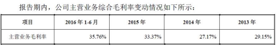 招股书显示,2013 年至2016 年 1-6 月,公司主营业务综合毛利率分别为 29.15%、27.17%、33.37%和 35.76%。