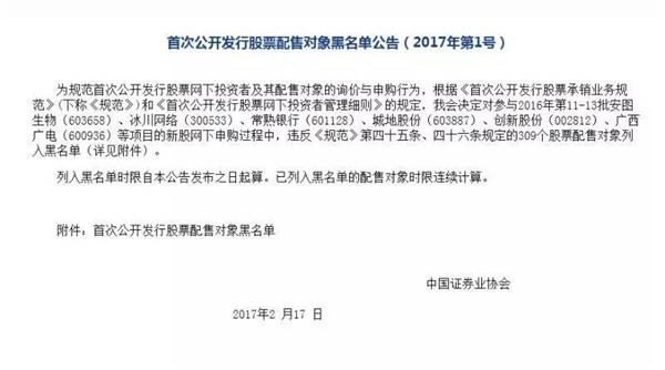 中国证券业协会(简称“中证协”),今日发布了2017年首次IPO股票配售黑名单的公示公告,这次公示数量高达309个,其中46个为专业机构和企业法人配售对象。这批违规名单的打新限制期为2017年2月17日至2017年8月16日。