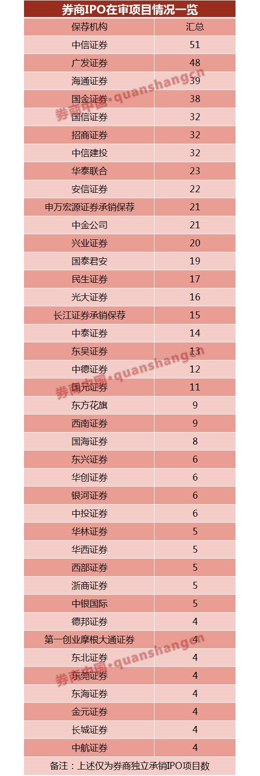 具体来看,中信证券、广发证券、海通证券、国金证券、国信证券、招商证券、中信建投在会项目数量均超过30个。其中,中信证券独立承销的在会IPO项目有51个,位居首位,紧随其后的是广发证券48个,海通证券39个在会IPO项目位居第三。