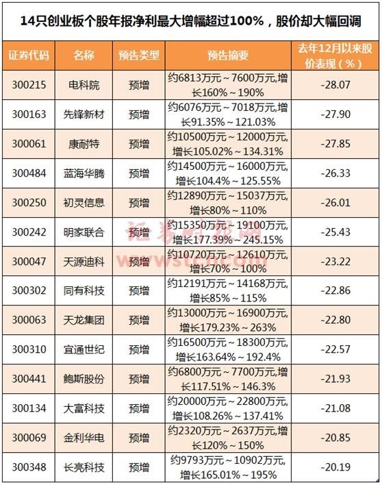 记者统计发现,创业板中,14股预告2016年净利润最大增幅超过100%,而股价自2016年12月以来却出现较大幅度的回调。