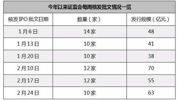 换言之,监管层除了在过年期间有两周没有核发批文外,以每周一批、每天2家左右的节奏,高速推进着新股发行。