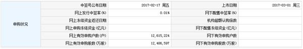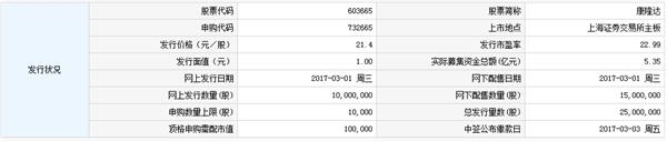 浙江康隆达特种防护科技股份有限公司于2017年3月1日进行网上和网下申购。本次公开发行股票总数量为2,500万股,回拨机制启动前,网下初始发行数量为1,500万股,占本次发行总量的60%;网上初始发行数量为1,000万股,占本次发行总量的40%。公司发行价格为21.40元/股,发行市盈率为22.99倍。股票简称为“康隆达”,股票代码为“603665”,网上申购代码为“732665”。拟在上交所主板上市。