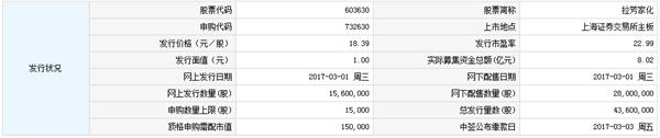 拉芳家化股份有限公司于2017年3月1日进行网上和网下申购。本次公开发行股票总数量为4,360万,回拨机制启动前,网下初始发行数量2,800万股,占本次发行总股数的64.22%;网上初始发行数量1,560万股,占本次发行总股数的35.78%。公司发行价格为18.39元/股,发行市盈率为22.99倍。股票简称为“拉芳家化”,股票代码为“603630”,网上申购代码为“732630”。拟在上交所主板上市。