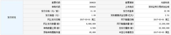 珠海光库科技股份有限公司于2017年3月1日进行网上和网下申购。公司本次公开发行股票总数量2,200万股,本次网下初始发行数量为1,320万股,为本次发行数量的60%;网上初始发行数量为880万股,为本次发行数量的40%。公司本次发行价格11.43元/股,发行市盈率为22.99倍。股票简称为“光库科技”,股票代码为“300620”。拟登陆深交所创业板上市。