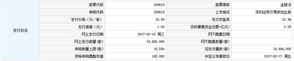 佛山市金银河智能装备股份有限公司于2017年3月1日起在深交所创业板上市交易。公司首次公开发行不超过1,868万股,本次发行价格10.98元/股,发行市盈率为22.98倍。股票简称为“金银河”,股票代码为“300619”。