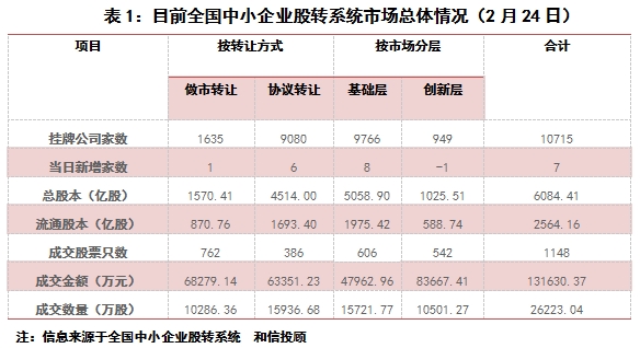 依据股转系统数据显示:至2017年2月24日,新三板市场挂牌总家数为10715家,市场再次出现月份相对增长。市场分布方面,创新层949家,基础层9766家;做市交易家数为1635家,协议转让家数为9080家。从规模来看,挂牌家数出现了规模化的发展。