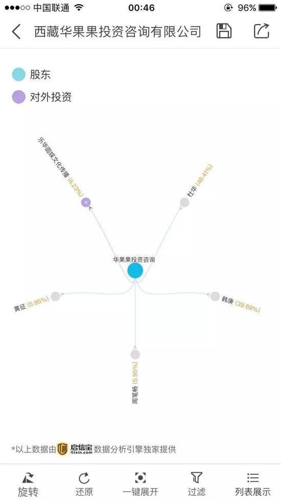 野马财经在乐华文化的股东名单中并未看到这些明星股东,不过其公开转让说明书中提到西藏华果果投资咨询有限公司为董事长杜华和核心艺人共有的持股平台,野马财经查阅工商资料发现西藏华果果的股东除杜华外,还包括韩庚(出资95.25万占比39.69%),周笔畅(出资14.28万占比5.95%),黄征(出资额14.28万).