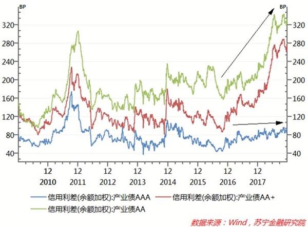 其次,金融机构风险偏好下降使得不同信用等级企业融资成本分化。理论上讲,市场上永远不缺资产,而是缺乏与金融机构风险偏好相匹配的资产。当前的“资产荒”,另一重要特征是不同信用等级企业融资成本明显分化。而此前的10年间,各类信用债利差走势几乎完全同步,融资成本差距长期保持相对稳定。在最近半年中,尽管资金供应环境明显宽松,但低信用等级的企业融资成本却持续保持高位,没有明显回落,且与高等级信用债的融资成本差距迅速扩大(参见下图)。其原因可能在于金融机构的风险偏好下降,对风险略高的企业融资支持明显不足,“惜贷”现象较为严重,而上一次金融机构惜贷较为严重的时期,还要追溯到1999年-2002年期间。