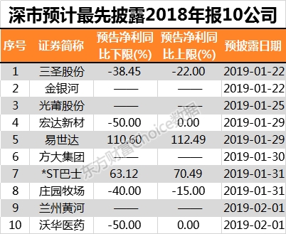 深市预约披露年报的前10家公司中,有6家公司此前已披露2018年年报预告,其中三圣股份和庄园牧场净利同比铁定下滑,而易世达和*ST巴士2018年全年净利是铁定上涨的。宏达新材和沃华医药尚存不确定性。