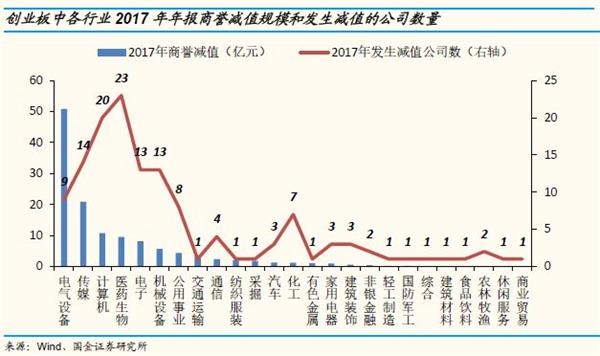 四、创业板商誉减值的行业特征:传媒、计算机、医药生物、电子等行业发生商誉减值的规模较高、公司数量较多。从减值规模来看,创业板中电气设备、传媒、计算机、医药生物、电子行业2017年发生商誉减值的规模相对较大。从计提商誉减值准备的公司数量分布来看,创业板中医药生物、计算机、传媒、电子、机械设备2017年发生商誉减值的公司数量相对较多。