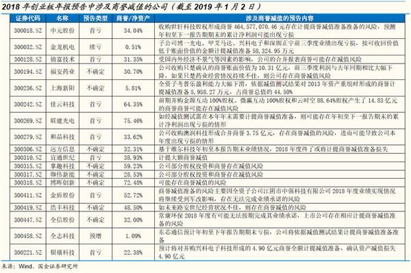 二、商誉减值信息通常在年报中披露,而创业板商誉减值风险将在1月中下旬创业板年报预告集中披露时暴露出来。根据要求,上市公司至少在每年年度终了时进行商誉减值测试,导致商誉减值信息在半年报和季报披露较少,而通常在年报中披露。创业板所有公司需要在次年1月31日前披露上一年的年报预告,从历史披露节奏来看,创业板年报预告的披露时间点集中在1月中下旬,年报中存在商誉减值风险或明确表明将要计提商誉减值准备的公司会在年报预告中有所表述,目前共有98家创业板上市公司披露了2018年年报预告,其中18家公司对年报中存在的商誉减值风险或计提商誉减值准备的情况进行了说明,高于去年同期的8家。