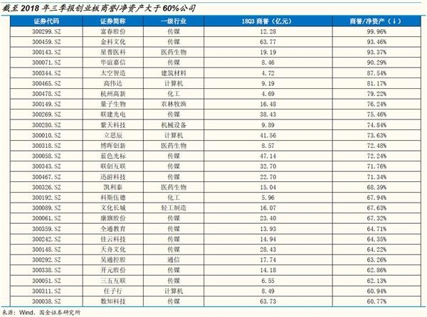 六、创业板中的三类公司2018年年报可能面临较大的商誉减值风险。1)明确在年报预告中披露了商誉减值风险或商誉减值准备计提情况的公司;2)截至18Q3商誉占净资产比值相对较高的公司;3)去年业绩承诺未完成且已经计提了商誉减值的公司,并且对该业绩承诺未完成的子公司所对应的商誉减值计提比例较低。