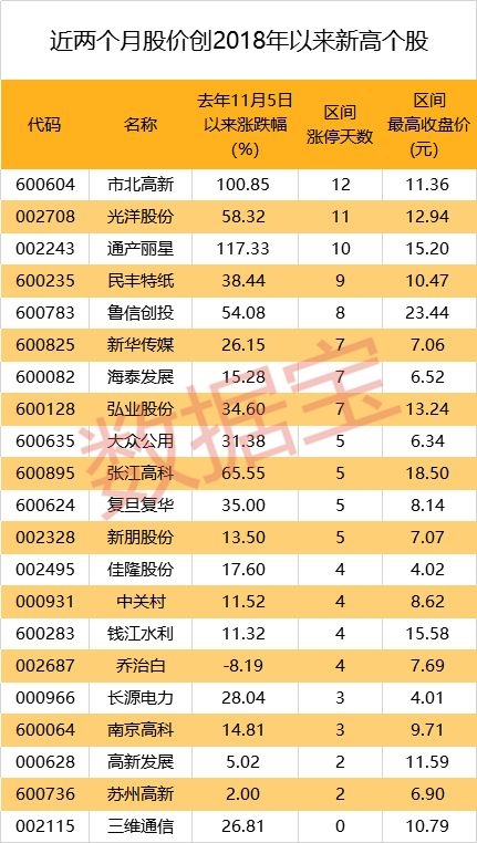 数据显示,自2018年11月5日至今,22股在此期间股价创2018年以来新高,其中通产丽星、三维通信1月2日收盘价均创2018年以来新高。