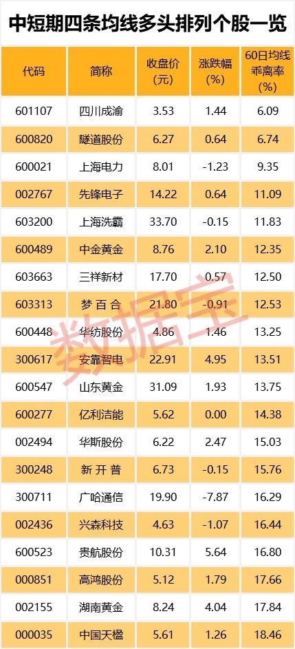 一般来说,均线多头排列代表买方力量强大,后市由多方主导行情概率较大。证券时报股市大数据新媒体“数据宝”统计,截至最新,37只个股5日、10日、20日、60日四条均线近日呈多头排列。其中四川成渝、隧道股份、上海电力股价与60日均线的乖离率最小,分别为6.09%、6.74%、9.35%。