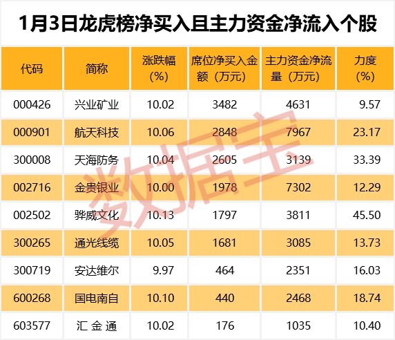 1月3日龙虎榜中机构及营业部席位资金净卖出3.00亿元,其中净买入的个股有18只;净卖出的个股有19只。净买入前三名个股分别是兴业矿业、航天科技、天海防务,净买入金额占当日成交额比例达7.20%、8.28%、27.72%。