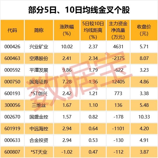 截至1月3日收盘,有14只A股的5日均线主动上穿10日均线,其中兴业矿业、空港股份、平潭发展等个股的5日均线较10日均线距离最大,分别达2.37%、2.34%、1.79%。