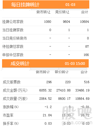 3日新增挂牌企业1家,挂牌企业总数达到10684家,做市转让1080家,协议转让9604家,待挂牌总家数87只,申报中总家数达到166家。