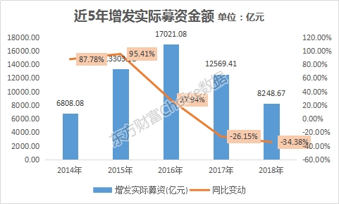 关于增发,东方财富Choice数据显示,2018年全年增发实际募资8248.67亿元,较2017年的12569.41亿元减少34.4%,也是自2016年后再次跌破万亿水平。