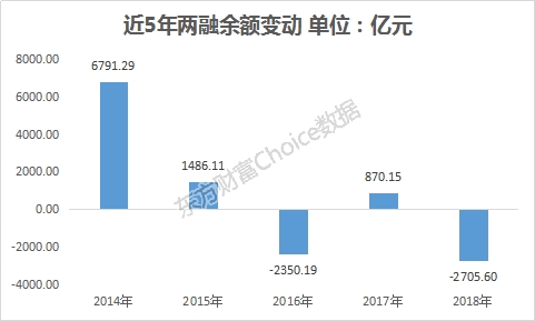 截至2018年底,东方财富Choice数据显示,沪深两市两融余额为7557.04亿元,较2017年底的10262.64亿元,减少2705.6亿元。而2017年则是增加的,为870.15亿元。
