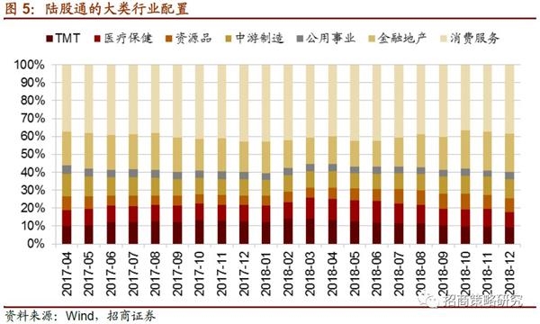 消费服务成为配比降幅最高的大类行业,配置比例震荡下降,占比全年累计下调4.56%;TMT行业的配比呈现持续下滑状态,全年下降3.08%;陆股通对医疗保健行业的配置比例先上升后下降,在5月达到最大值(12.1%)后持续下降,全年累计降低1%。