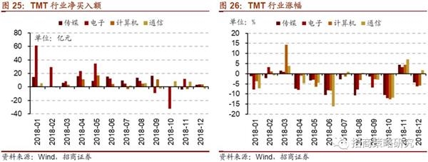 陆股通调仓方面,按照申万一级行业分类,2018年12月有22个行业加仓,6个行业减仓。具体地,加仓幅度最大的为银行业,加仓0.71%;其他加仓行业主要包括非银金融、交通运输,加仓比例分别为0.37%、0.24%,其次为农林牧渔、房地产、电气设备、公共事业、食品饮料等,加仓比例均不低于0.15%。减仓幅度较高的为医药生物,减仓比例为0.37%,商业贸易减仓0.05%,其他小幅减仓行业包括综合、钢铁、通信、建筑材料等,减仓比例均不超过0.05%。
