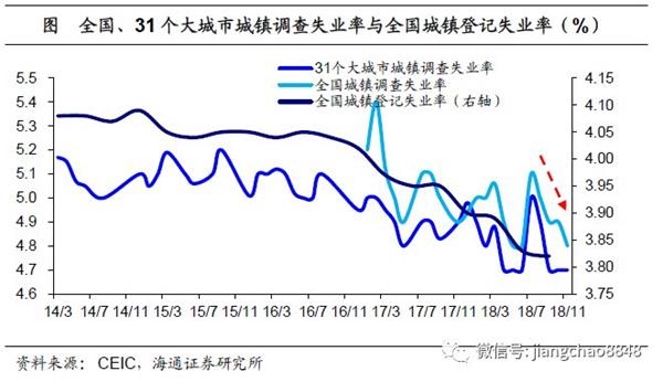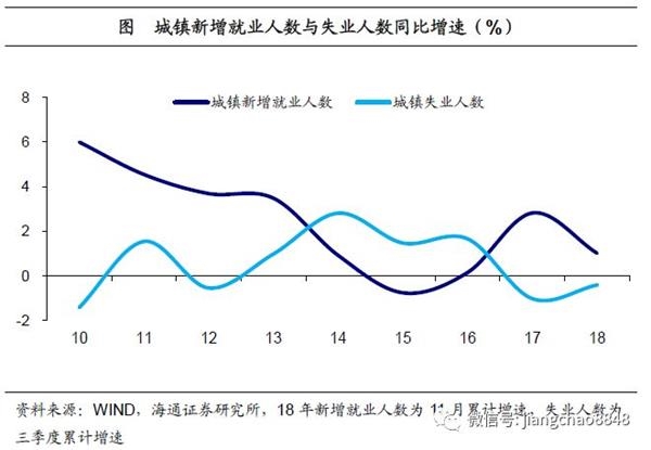 新增就业增速放缓,失业增速触底回升。人社部和统计局对就业统计的另一类重要指标即是就业和失业人数,一般来说,两者之间存在着反向变动的关系。18年11月城镇新增就业人数累计值虽然创下13年以来的同期新高,但累计增速只有1%左右,较17年城镇新增就业2.8%的增速水平有明显的放缓。此外,从失业人数上来看,18年3季度城镇失业人数仍较17年同期减少,但同比增速仅-0.4%,比17年底的增速降幅也有明显收窄。