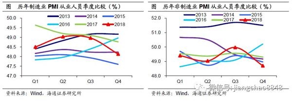就业预期下行,服务业压力更大。此外,反映经济景气预期的PMI指标体系中也有对就业情况的刻画。18年以来,制造业PMI从业人员指数均要低于17年同期,而四季度更是显著下滑,创下自16年以来的同期新低。非制造业PMI从业人员指数在四季度也有明显的下行,创下13年以来的同期新低,而其中服务业更是刷新了13年以来的季度值新低。由此可见,PMI从业人员指标也反映出就业的预期正在转差,我国的就业的确存在着一定的压力。