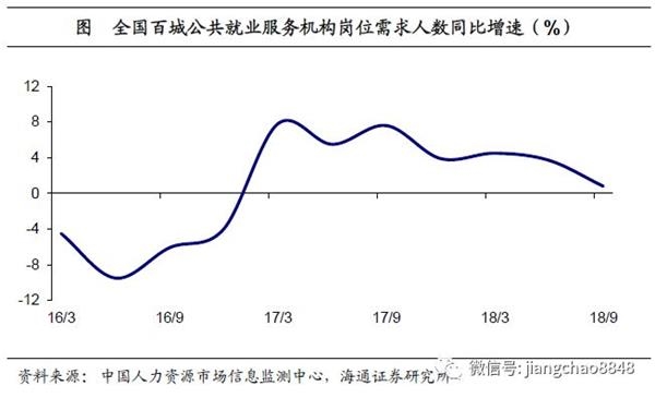就业服务机构岗位需求增速走低。根据中国人力资源市场信息监测中心对近百家城市公共就业服务机构岗位供需情况所做的统计,18年以来用人单位的岗位需求人数增速在持续放缓,从1季度的4.5%回落至3季度的0.8%,增速几近归零,需求情况较17年明显偏低,这意味着企业的用工意愿可能正在转弱。此外,其它类型就业服务机构的数据也呈现出同样的趋势,根据中国人民大学就业研究所与智联招聘合作发布的《中国就业市场景气报告》,18年三季度基于智联招聘数据统计的招聘需求人数同比下降27%,较2季度的跌幅继续扩大。