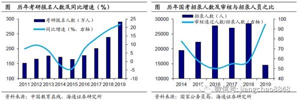 考研考“公”热度攀升,毕业去向折射求职压力。18年无论是考研还是考“公”的热度均在攀升,报名参加2019年研究生考试的人数达到创纪录的290万人,同比增速突破20%,而据中国教育在线对19年考生考研动机的调查,就业压力大排在首位,占比接近40%。2019年国家公务员考试虽然招录人数较18年缩减近一半,但资料审核通过人数仅缩减不到20%,这也造成审核通过人数与招录人数之比达到95:1的新高。挤破头的考研和考公无疑说明毕业生(其实也不仅是毕业生)求职压力的加大,在企业谋求一份理想工作可能并不容易。