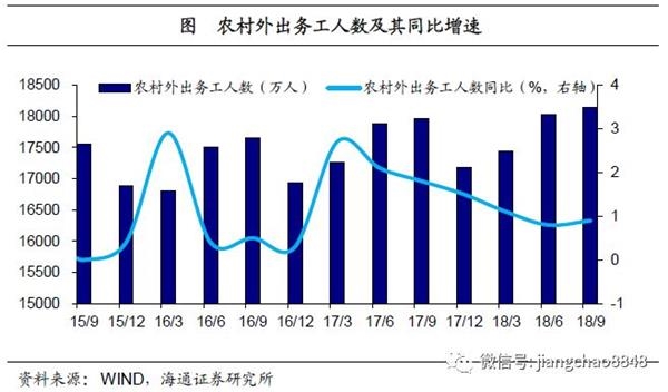农村外出务工增速放缓,城市因何吸引力不再?农民工是就业中的另一重点群体,但18年以来,外出务工的农民工增速已不如前,17年农村外出务工人数季度同比增速尚能维持在1.5%水平以上,而18年二、三季度增速水平已不足1%,为何外出务工对于农民的吸引力不再?诚然这可能与产业转移、农民工年龄结构变化等多种因素有关,但在城乡之间工资水平差距仍然存在的情况下,外出务工人数增速的放缓或也反映了城市能够提供适合农民工就业的岗位正在减少。