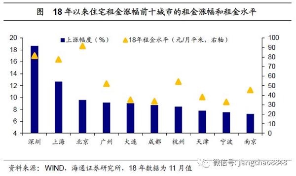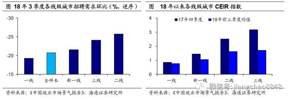 各线级城市之间就业形势的分化或与就业人口流动相关。随着一线城市各项生活成本的上升,以及部分一线城市户籍限制依然存在,在其中定居就业已经变得颇为不易,特别是18年以来一线城市的房租成本有了明显的上涨,18年涨幅均在9%以上,包揽全国城市租金涨幅的前四席,深圳和上海两城市租金涨幅更是高达19%、13%。高房价高房租或倒逼就业人口从一线城市回流到二三线城市,由此引发了二三线城市求职人数的回升,但经济回落态势下,二三线城市难以创造更多合适的岗位满足就业需求,因而就业压力日渐增强。