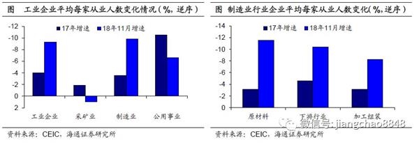 去产能对制造业用工影响较大。对制造业的子行业做以进一步区分,我们发现,在从业人数普遍回落的大背景下,中游原材料行业的收缩幅度更为明显,18年11月规模以上中游原材料类制造业企业,每家平均的从业人员数量增速跌幅要比17年扩大超过8个百分点,而中游加工组装类制造业行业和下游行业跌幅仅扩大5-6个百分点。中游原材料类制造业从业人员数量的下滑主要同去产能有关,像受到去产能政策影响较大的有色、水泥行业平均每家企业用工人数18年增速跌幅均较17年扩大10个百分点以上,但钢铁行业由于企业数量较从业人员数量收缩程度更大,因此18年平均每家规模以上企业的从业人员数量较17年不降反升。
