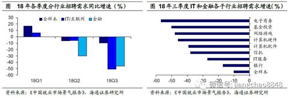 金融与IT行业风光不再。而服务业中金融和IT行业的就业变化值得关注,根据人大和智联招聘合作发布的《中国就业市场景气报告》,18年特别是二三季度以来,金融和IT行业的招聘需求同比增速大幅回落,远高于整体需求下滑的幅度。而且其统计的各个IT子行业,如网络游戏、计算机软件和电子商务等均表现不佳,金融中则主要受到非银子行业的拖累,二三季度基金证券投资子行业的同比增速跌幅均超过30%,银行业需求下滑幅度也超过整体水平,但相对要好于非银。这意味着曾经的高薪行业或正在缩减招聘计划,而裁员降薪的新闻也屡见报端,这些行业如今对求职者而言可能并不友好。