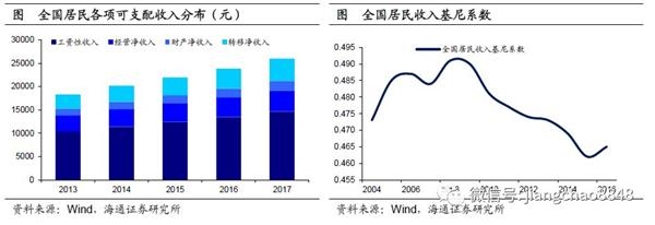 就业转弱拖累收入。工资收入是居民收入最主要的组成部分,就业下滑对居民收入将造成很大冲击。根据统计局调查,2017年我国居民人均可支配收入2.6万元,其中工资性收入接近1.5万元,占总收入比重超过一半,而转移净收入和财产净收入占比分别为18%和8%。所以对于失去工作的人来说,没有工资收入将极大地影响整体收入水平。