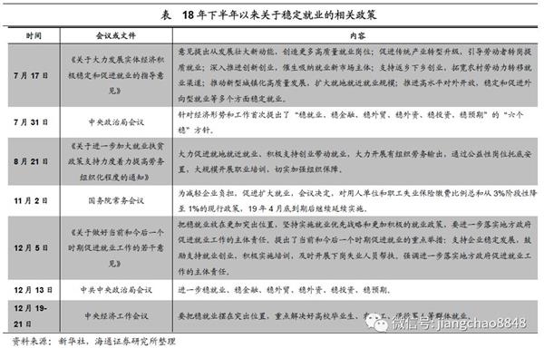 围绕着稳定就业,各部门18年下半年以来又陆续出台了多项举措。其中7月10日发改委联合17个部门出台《关于大力发展实体经济积极稳定和促进就业的指导意见》,提出从十个方面稳定和促进就业。而8月21日人社部和财政部又联合出台《关于进一步加大就业扶贫政策支持力度着力提高劳务组织化程度的通知》,提出大力促进就地就近就业,积极支持创业带动就业,大力开展有组织劳务输出。此外,11月2日总理在主持召开的国务院常务会议上决定延长用人单位和职工失业保险缴费比例下降的政策执行时间。而12月底召开的中央经济工作会议也提出要把稳就业摆在突出位置,重点解决好高校毕业生、农民工、退役军人等群体就业。