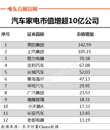 从市值变化来看,A股汽车和家电行业共计235只个股,1月9日当天,累计市值增加677亿元,再加上吉利汽车和北京汽车等港股增加的至少75亿元,昨天一天两大板块市值增加至少750亿。