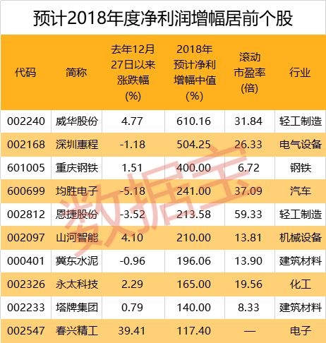 上述410股中,147股发布2018年报预告,115股2018年度业绩预喜(预增、略增、扭亏及续盈),占比近八成。11股净利润增幅超过100%,包括冀东水泥、威华股份、均胜电子等。