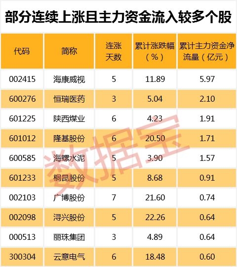 值得注意的是,185只连续上涨个股中,5只个股期间主力资金累计净流入超过亿元。其中,累计资金流入最多的为海康威视,主力资金累计流入5.97亿元。