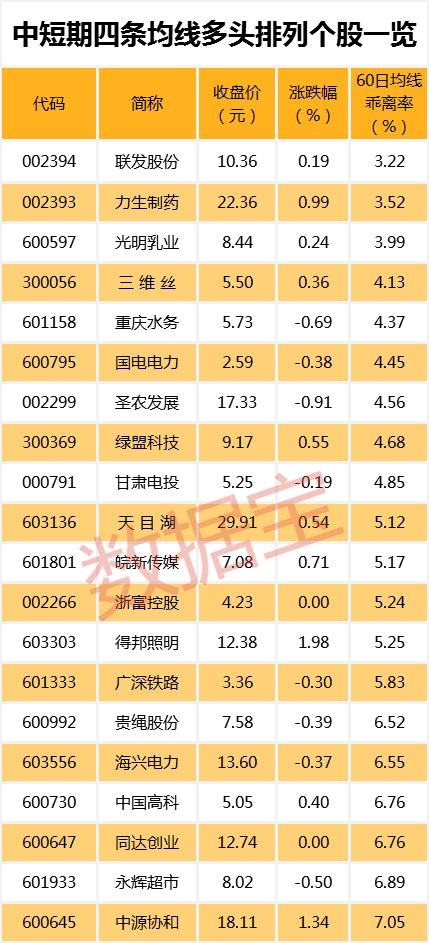 目前两市共有133只个股5日、10日、20日、60日四条均线近日呈多头排列。其中联发股份、力生制药、光明乳业股价与60日均线的乖离率最小,分别为3.22%、3.52%、3.99%。