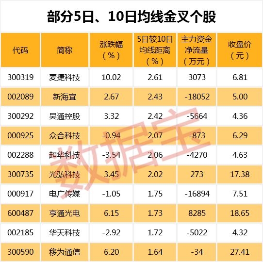 截至1月10日收盘,有106只A股的5日均线主动上穿10日均线,其中麦捷科技、新海宜、吴通控股等个股的5日均线较10日均线距离最大,分别达2.61%、2.43%、2.42%。