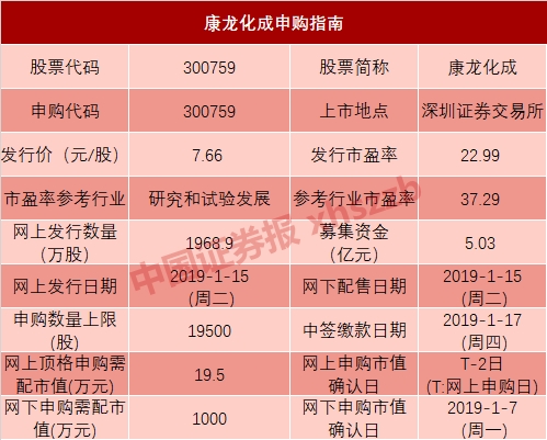 从今天开始,沪深两市在3天内将迎来5只新股申购。分别是今天(1月15日)创业板的康龙化成(申购代码:300759),16日中小板的新乳业(申购代码:002946)、沪市主板的威尔药业(申购代码:732351),以及17日创业板的华致酒行(申购代码:300755)、创业板的七彩化学(申购代码:300758)。