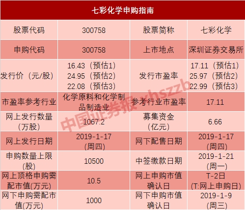 康龙化成、新乳业、威尔药业和华致酒行,4只新股的发行价分别为7.66元/股、5.45元/股、35.5元/股、16.79元/股,顶格申购分别需要深市市值19.5万元、深市市值25.5万元、沪市市值16万元、深市市值23万元。七彩化学的预估发行价为16.43元/股(预估一)、24.95元/股(预估二)、22.08元/股(预估三),不排除推迟发行的可能性。